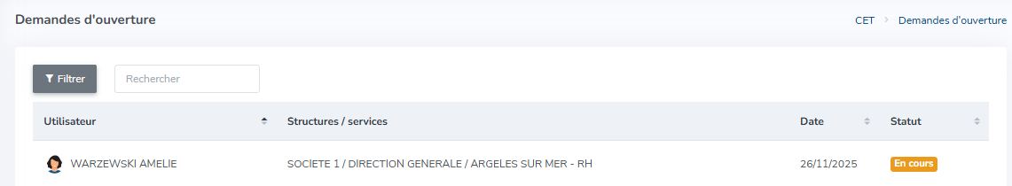 Tant que l'action d'approbation ou de refus ne sera pas intervenue sur cette demande d'ouverture, l'application empêche toute autre action sur le module CET pour cet utilisateur.