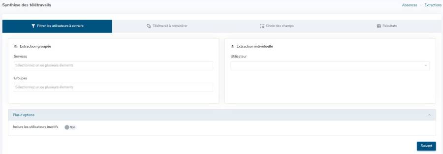 Pour créer une nouvelle extraction, cliquez sur Réaliser une nouvelle extraction et sélectionnez “Synthèse des télétravails” :