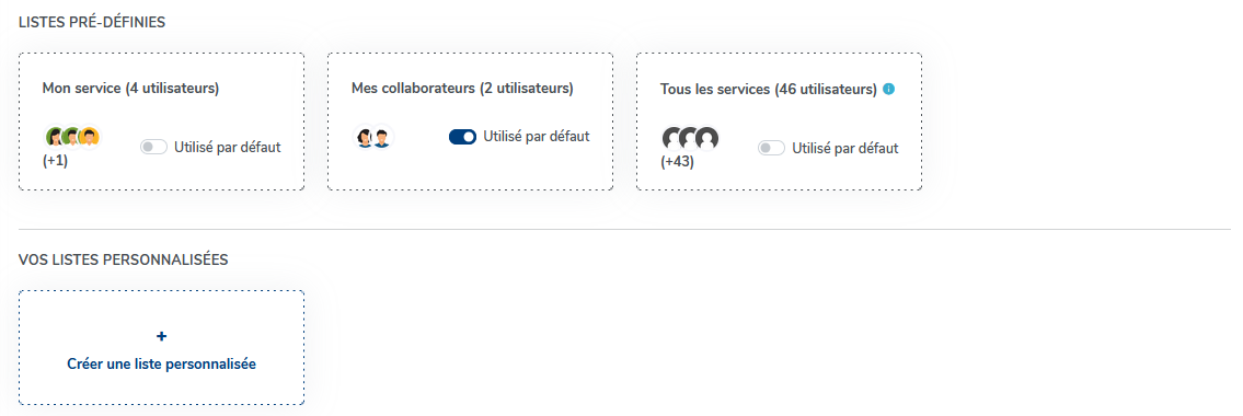 Au clic sur le libellé, il vous sera proposé des listes pré-définies parmi lesquelles vous retrouverez “Mon service”, “Mes collaborateurs” et “Tous les services” si votre profil le permet. Vous pouvez choisir de cocher par défaut l'affichage qui vous convient.