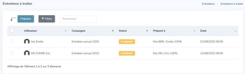 Une fois votre entretien complété à 100%, le statut de celui-ci passera à “Préparé” :