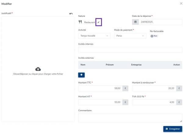 Cliquez sur le crayon à côté de la nature de frais afin de la modifier puis Enregistrer :