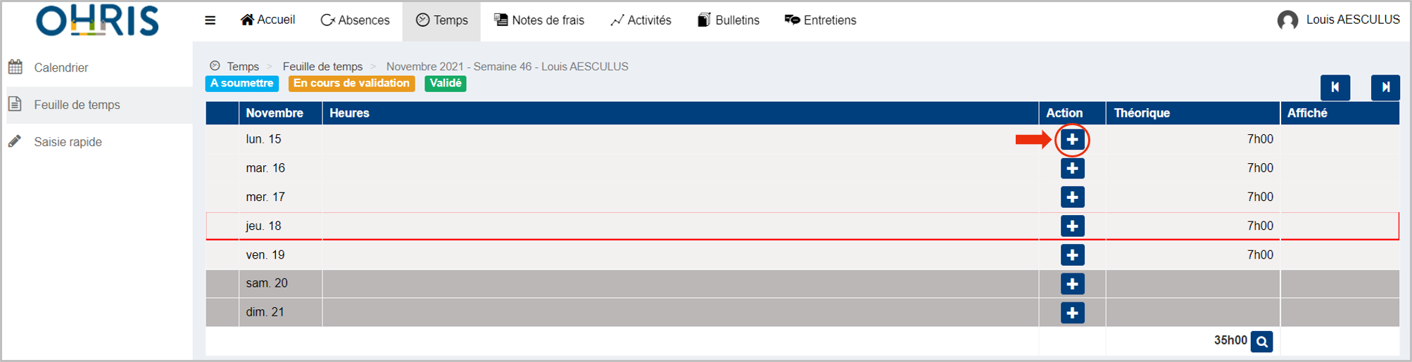 La procédure permettant d'accéder à votre feuille de temps hebdomadaire est disponible ici : https://documentation.ohris.info/doku.php/module_temps:acceder_a_une_feuille_d_heure_hebdomadaire