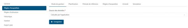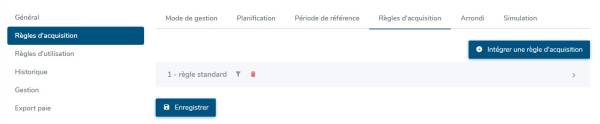 - Règles d'acquisition : L'écran affiche un tableau où seront listées les règles paramétrées. Cliquez sur Intégrer une règle d'acquisition pour sélectionner celle qui correspond à votre besoin.