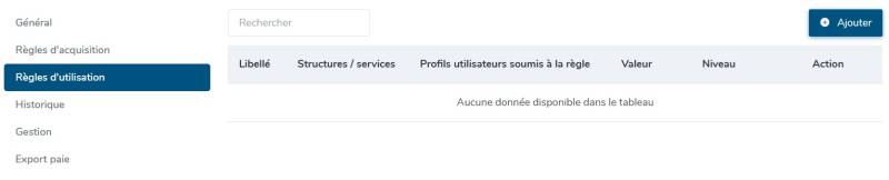 L’écran affiche un tableau où seront listées les règles d’utilisation paramétrées.