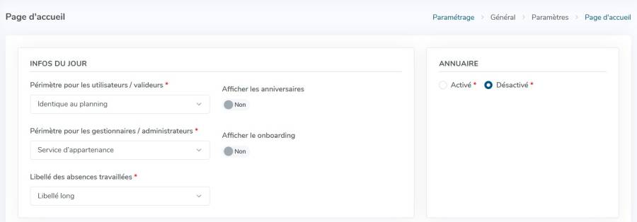 Rendez-vous sur l'écran de paramétrage : Paramétrage > Général > Paramètres > Page d'accueil