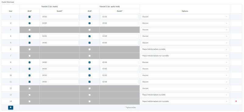 Bien renseigner la notion de Repos hebdomadaire ouvrable et/ou Repos hebdomadaire non ouvrable (le plus souvent sur le samedi et le dimanche) afin de permettre le cadencement des semaines et les décomptes corrects dans l'application.