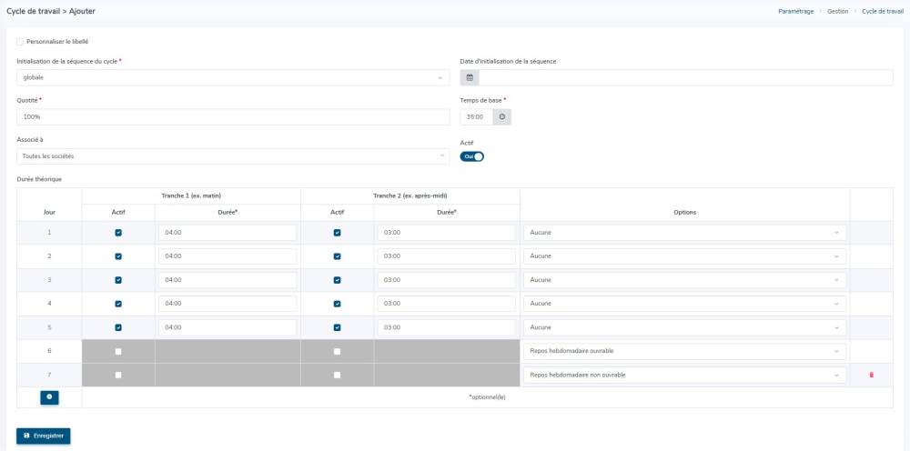 * Actif : Choisissez si vous souhaitez que le cycle de travail soit actif ou inactif.