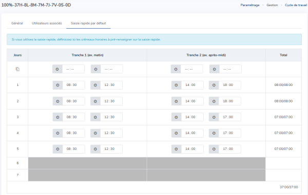 Un dernier onglet “Saisie rapide par défaut” peut être affiché que si le module Temps est activé et si au moins une nature d'heures de saisie rapide est renseignée dans un profil d'heures : rdv sur cette page pour plus d'informations.